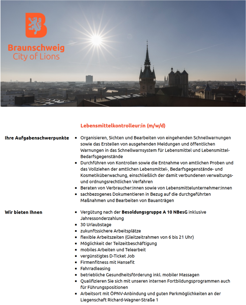 Die Stadt Braunschweig sucht Lebensmittelkontrolleurin / Lebensmittelkontrolleur (m/w/d) mit der Bewerbungsfrist: 19. April 2026 mit der Vergütung nach der Besoldungsgruppe A 10 NBesG inklusive Jahressonderzahlung. Weiteres kann der Stellenanzeige entnommen werden.